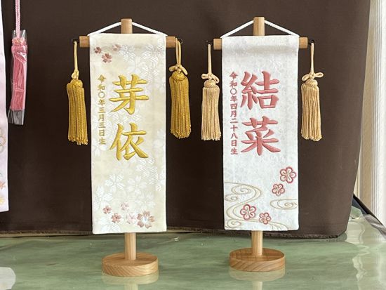 「流水に梅」はキラキラしたラメ入りの白生地が美しい名前旗。「桜扇」は小桜紋のベージュ生地にシンプルな桜刺繍が可愛い、上品な名前旗です。特小サイズは小さめの親王飾りやケース飾りにマッチするサイズです